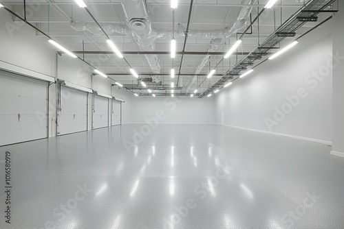 warehouse, industrial, empty, space, concrete, floor, metallic, white, wall, pipe, wire, ceiling, open, room, clean, tidy, unoccupied, organised, bright, illuminated, clear, orderly, structure, shed, garage, interior, storage, empty space, industrial area, factory, production, manufacturing, logistic, distribution, transportation, handling, equipment, machinery, system, infrastructure, facility, building, construction, architecture, design, modern, contemporary