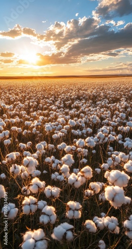 large field of cotton, with white fluffy flowers covering the entire ground under a blue sky and white clouds.