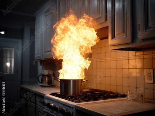 fire, flames, blaze, burning, accident, emergency, danger, risk, prevention, extinguisher, heat, burn, damage, insurance, cooking, stove, pot, pan, carelessness, appliance, home cooking, fire alarm, first aid, dial 911, emergency services, fire department, firefighter, evacuation, carbon monoxide, flammable, combustion