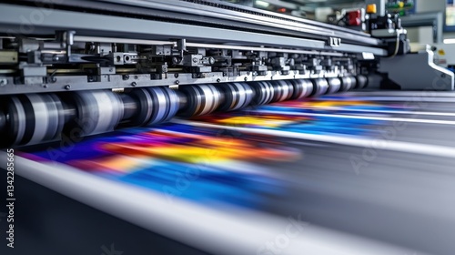 Large format printer prints vibrant colors onto a big sheet. Great for showcasing innovation and efficiency in the printing industry.