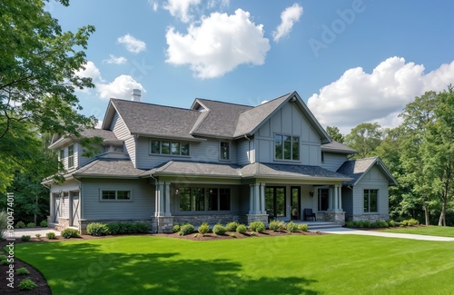 Large grey craftsman style house with neat lawn and manicured bushes. Driveway and garage are visible. The residence sits among green trees under a blue sky with white clouds.