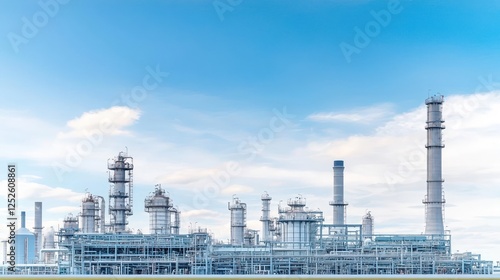 industrial, plant, factory, building, sky, blue, white, equipment, pipe, tower, infrastructure, manufacturing, chemical, refinery, large, complex, exterior, modern, architecture, technology, facility, industry, business, commercial, daylight, horizon, panorama, landscape, cloud, sunny, bright, metal, structure, pipeline, processing, energy, power, industrial park, background, clear, panoramic, view, wide