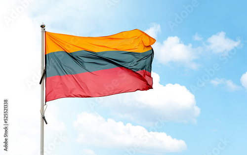Large Lithuanian national flag on flagpole waving in wind against blue cloudy sky