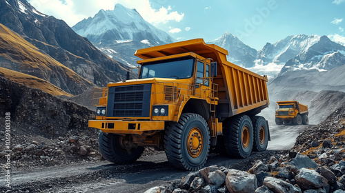 mining, truck, dump truck, mountain, mine, industry, heavy equipment, machinery, transportation, quarry, mineral, extraction, resource, geology, industrial, work, vehicle, haul, ore, rock, stone, gravel, earth, landscape, nature, environment, power, strength, rugged, remote, high altitude, snow, peak, mountain chain, commercial, blue skies, cloud, dirt road, construction, engineering, equipment, metal, steel, big, powerful, yellow, orange, machine