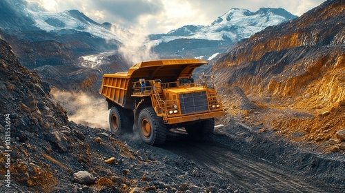 truck, mining, vehicle, landscape, mountain, dirt, machinery, earth, construction, industry, transport, heavy, equipment, quarry, load, terrain, dust, rock, road, excavation, site, nature, power, work, labor, operation, environment, safety, sky, cloud, weight, performance, productivity, haul, capacity, rugged, efficiency, resource