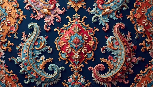 Large scale paisley damask, rich color palette, luxurious feel , classic design, seamless pattern, tapestry