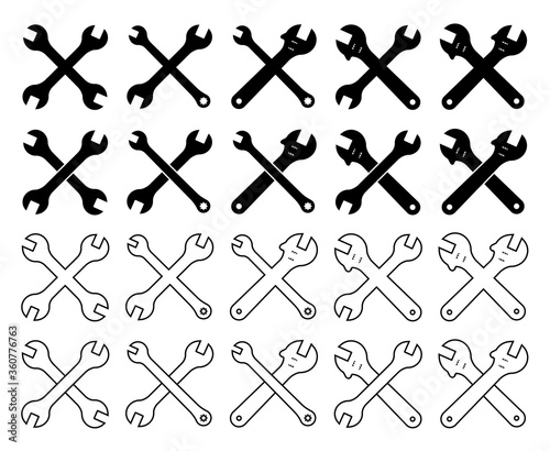 large set of crossed wrench icons for repair of various shapes. Vector on a white background