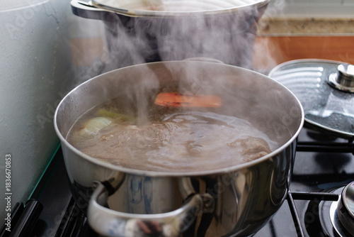 cooking, boiling, pot, saucepan, stainless, steel, beef, meat, soup, broth, stock, vegetable, carrot, onion, celery, water, bubble, stove, gas, burner, steam, simmering, hot, kitchen, home, indoor, meal, dinner, lunch, homemade, food, comfort, closeup, sideview, cookware, ingredient, simple, nobody, appliance, silver, metal, liquid, traditional, hearty, healthy, classic, receipe, preparation, kitchen utensile