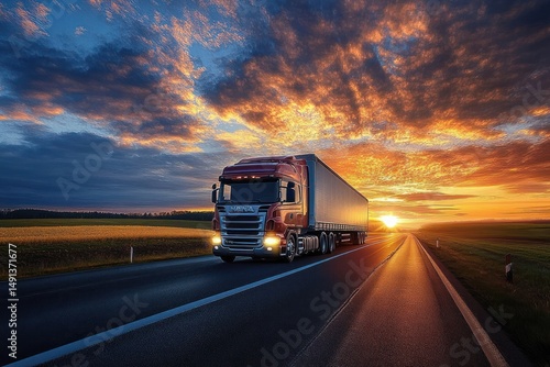 truck, transport, road, sunset, sky, cloud, sun, highway, vehicle, cargo, freight, transportation, open road, nature, evening, landscape, rural, field, travel, scenic, scenery, traffic, industry, journey, motion, sunlight, asphalt, vibrant, colorful sky, dusk, scenic route, countryside, roadway, speed