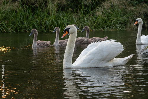 Large white mute swan gracefully swims alongside its cygnets in calm waters during sunset
