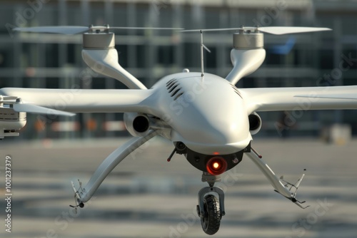 drone, surveillance, aerodrome, security, technology, unmanned, aerial, vehicle, aircraft, flying, flight, remote, control, modern, futuristic, innovation, aviation, transportation, air, travel, industry, propeller, rotor, blade, camera, sensor, equipment, system, monitoring, safety, protection, military, government, law, enforcement, police, border, patrol, reconnaissance, intelligence, datum, sky, background, white, landing, gear, hovering, day