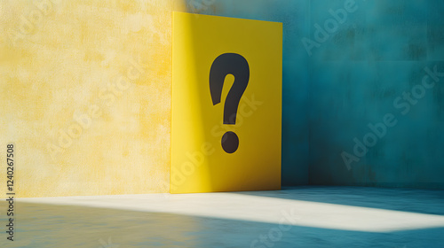large yellow question mark stands against vibrant wall, casting shadow on floor. scene is bathed in soft light, creating sense of mystery and curiosity