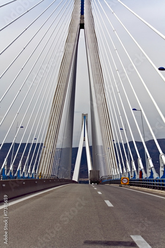 architecture, design, modern, public, structure, aerial, cable, bridge, construction, technology, length, large, technique, civil, engineering, record, earth, pylon, deck, crossing, high, road, highway, suspension, way, passage, street, travel, greece, greek, europa, truck, signs, traffic, asphalt, destination, touristic, triangle, column, post, wire, wired