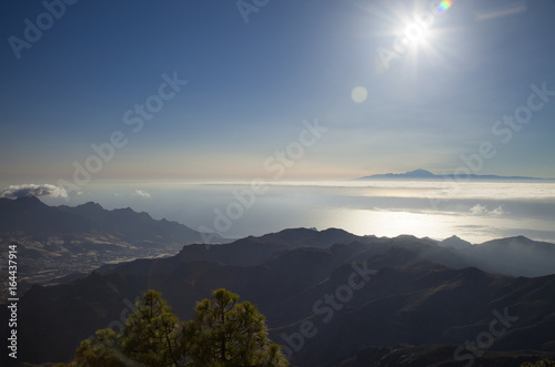 gran canaria, atlantic ocean, sunset, evening, change, transition, illumination, cloud, layer, peak, tallest, mountain, over, volcano, teide, outline, silhouette, tenerife, different, view, horizon, island, seen, wood, reserve, nature, natural, colours, colourful, orange, blue, lilac, forest, black, scattering, light, afternoon, late, setting, going, down, aboriginal, name