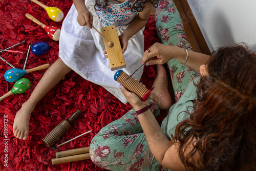 Latin American music teacher giving rhythmic music lessons with percussion instruments