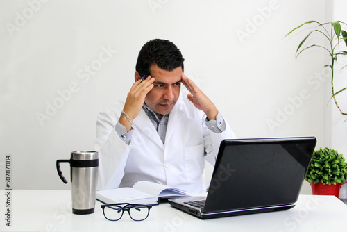 Latino medical doctor man with gown and face mask feeling sick with headache, migraine from burnout, exhaustion result of excessive and prolonged emotional, physical, and mental stress
