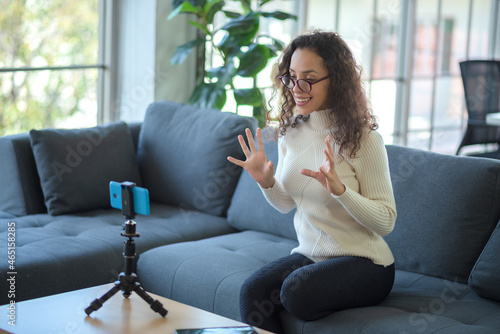 Latino woman facetime with smartphone Works remotely, Social Distancing, New Normal concept.