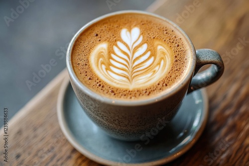 Latte Art Closeup in Coffee Cup on Rustic Wooden Table with Leaf Design in Soft Natural Light