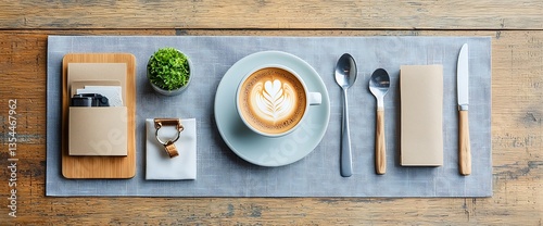 hot drink, latte, art, cappuccino, breakfast, drink, table, setting, cutlery, napkin, wooden, placemat, cafes, eatery, dining, morning, beverage, hot, foam, nubes, floral, cup, plate, spoon, knife, napkin, stylish, minimalist, modern, elegant, natural, simple, design, comfortable, relaxing, ambience, rustic, tableware, interior
