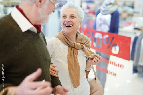 family, man, retail, shopper, shopping, together, happy, leisure, weekend, senior, couple, husband, wife, spouse, woman, caucasian, department, store, mall, boutique, discussing, talking, smiley, laughing, sale