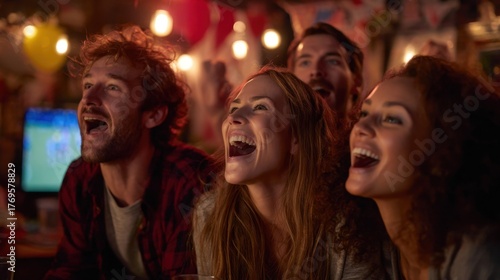 friends, celebration, gathering, sport, pub, excitement, laughter, joy, cheer, entertainment, camaraderie, socialising, community, nightlife, fun, happiness, connection, atmosphere, event, drink, crowd, oneness, enjoyment, anticipation, cheer, game, smile, energy, revelry, evening, party, togetherness, lively, night out, leisure