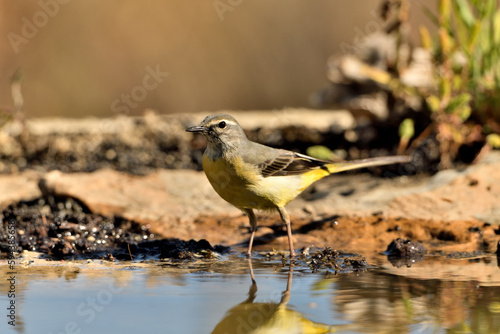 lavandera cascadeña (Motacilla cinerea) posada en el borde del estanque