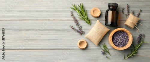 Lavender and rosemary aromatherapy essentials on a gray wooden surface