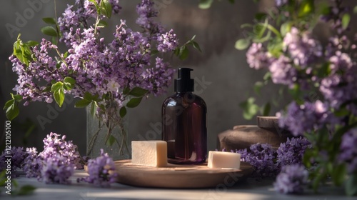 Lavender and skincare products on a wooden tray