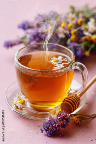 Lavender chamomile tea with honey and flowers