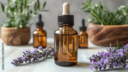 Lavender essential oil bottle, rosemary, spa, wellness, background
