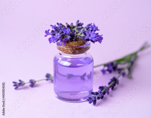 lavandula, essential, oil, bottle, flower, purple, aromatic, fragrance, cork, natural, aromatherapy, calming, relaxation, floral, herb, spa, wellness, fresh, botanical, soothing, beauty, scent, rustic, health, organic, decoration, therapy, holistic, pastel, arrangement