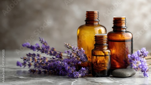 lavandula, essential, oil, bottle, amber, glasses, flower, purple, grey, background, still, life, aromatherapy, health, beauty, product, natural, organic, care, spa, therapy, treatment, wellness, display, studio, shot, isolated, copy, space, calm, relaxation, fragrance, healing, medicine, ingredient, herbal, photo, photo, commercial, editorial, use, light, grey, texture, decorative, stone, closeup, close, up