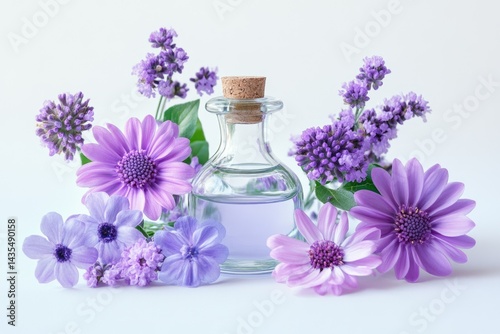 lavandula, essential oil, purple flower, aromatherapy, fragrance, perfume, natural, botanical, floral, beauty, wellness, spa, relaxation, calm, serenity, peace, calmness, herbal, medicine, health, healing, organic, wildflower, daisy, phlox, bottle, glasses, cork, spring, summer, vibrant, delicate, soothing, aromatic