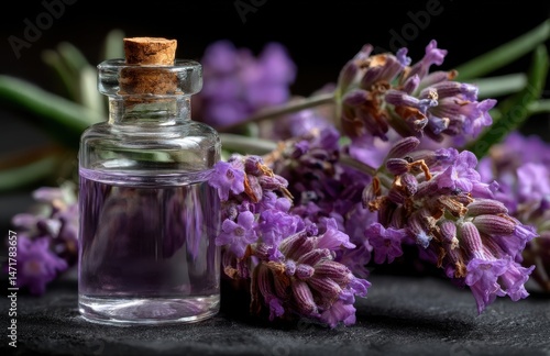 lavandula, essential oil, aromatherapy, alternative medicine, wellness, relaxation, spa, beauty, fragrance, perfume, herbal, flower, plant, purple, glass bottle, cork, dark background, health, natural, organic, therapy, treatment, aroma, scent, floral, herbal medicine, natural medicine, well-being, calmness, calmness, skincare, cosmetic, homeopathy, naturopathy, medicinal plant