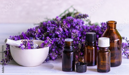 Lavender essential oil in glass dropper bottles with fresh flowers.