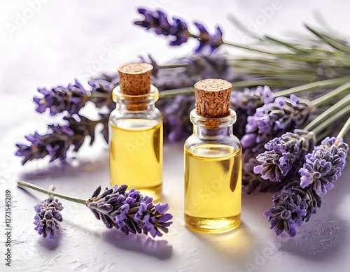 Lavender Essential Oil in Small Bottles with Fresh Lavender Flowers