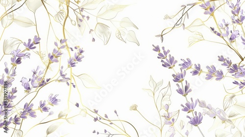 Lavender floral, luxury botanical on white background vector, empty space in the middle to leave room for text or logo, gold line wallpaper, leaves, flower, foliage, hand drawn