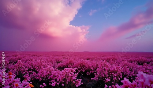 Lavender Horizon: An endless field of lavender flowers stretches towards the horizon, painted in a palette of vibrant purple and pink hues, reflecting the soft glow of the sunset.