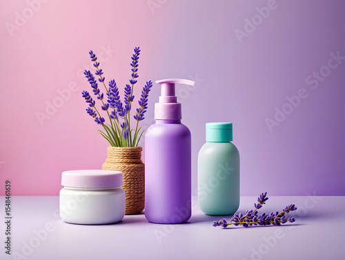 Lavender scented skincare products on purple background