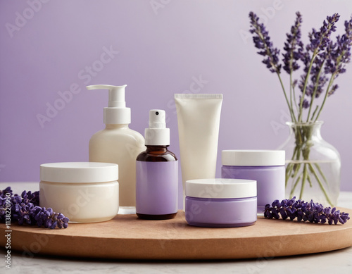 Lavender Spa Products on White Table with Fresh Flowers in Soft Light