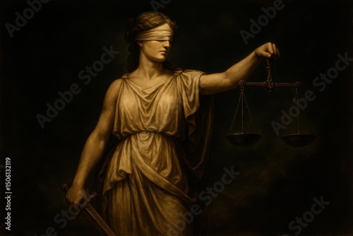 law, justice, dark background, legal system, authority, scale, sword, goddess, personification, classical, symbolic, art, illustration, digital artwork, legal, court, judgement, balance, fairness, ethic, morality, power, strength