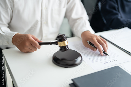 Lawyer businessman working with lawbook in office or courtroom Legal counsel with gavel and legal law. justice and lawyer concept Judge gavel hammer on Lawyer desk.