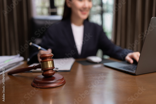 Lawyer Businesswoman Working with Documents and Signing Contract at Office Desk, Hammer on Wood table, Judge's Gavel, Law, Justice Symbol,