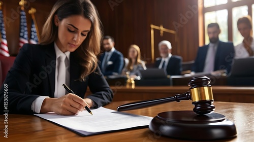 lawyer court signature. A focused female lawyer writes notes in a courtroom while a judge and audience observe, showcasing a serious legal atmosphere.