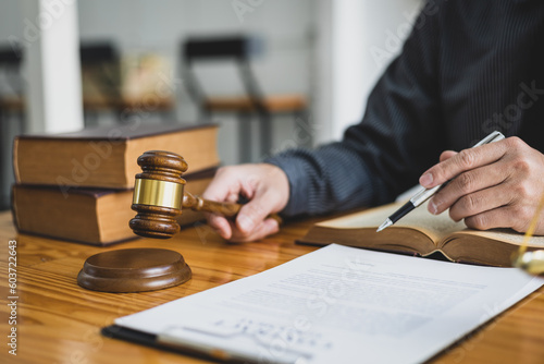 Lawyer reading a book and working in a law firm, Legal counsel and justice concept.