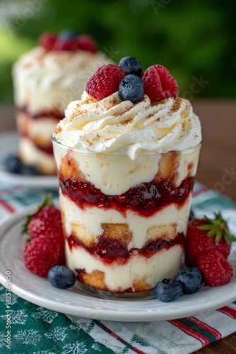 Layered berry parfait with cream, cake pieces, and fresh berries served in a glass cup