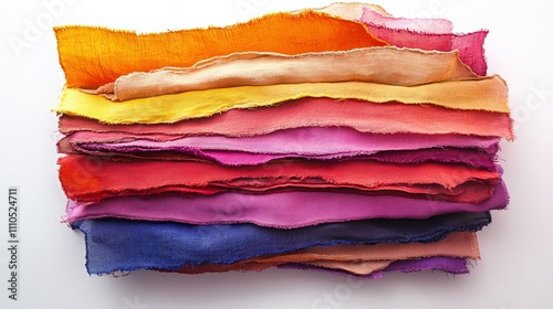 layered fabric swatches, vibrant textile stack, peach pink orange yellow red purple blue, raw edges, natural linen texture, high contrast colors, macro photography, clean white background