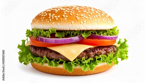 "Layered hamburger with sesame bun, beef patty, cheddar, tomato, lettuce, and red onion, showcasing vibrant fast food composition in a bright, casual setting with mouthwatering appeal."