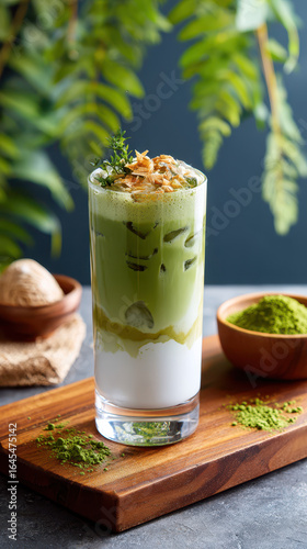 Layered matcha drink with coconut milk, garnished with toppings, served on a wooden cutting board surrounded by green elements