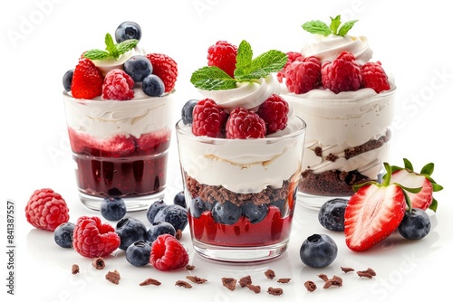 Layered parfaits with fresh berries and cream, presented in elegant glasses against a bright background, showcasing a balance of texture and flavor